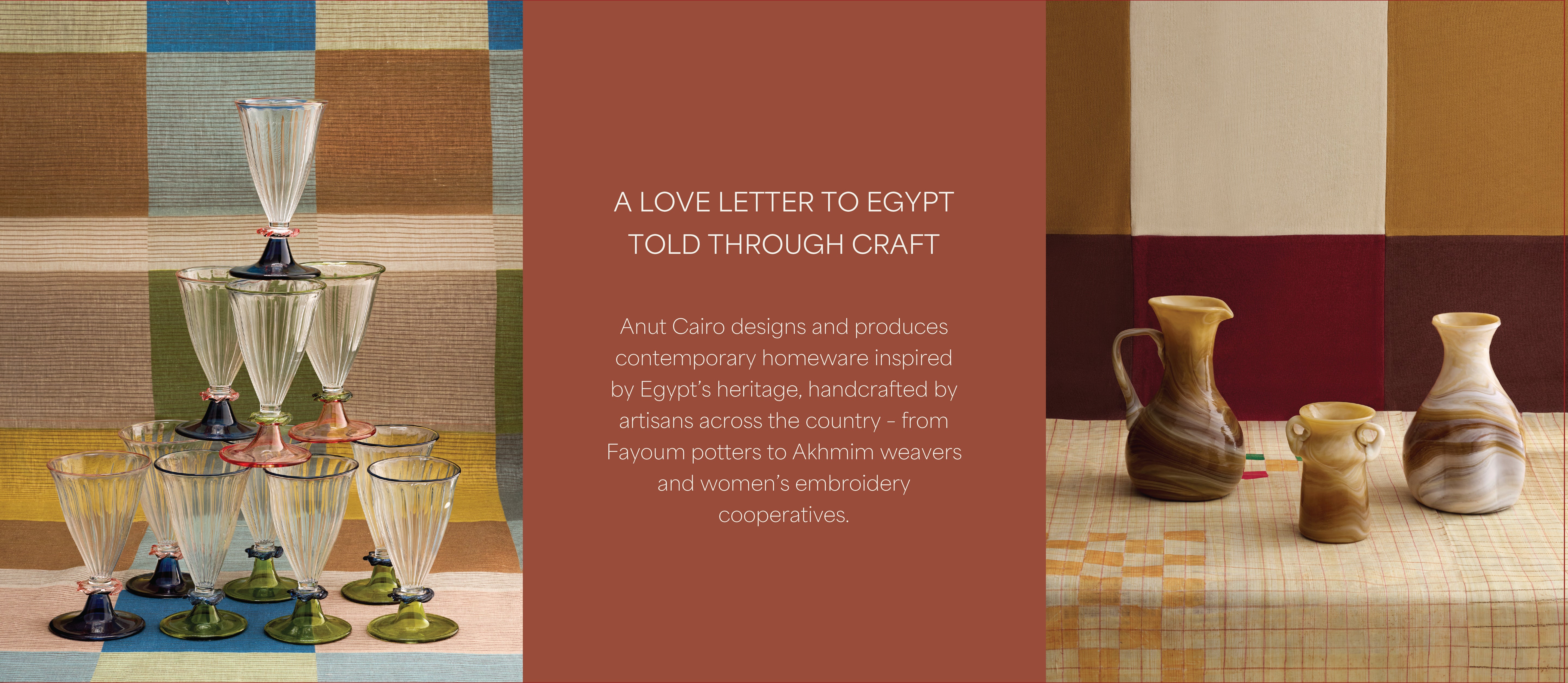 The artisans we work with span from the potteries of Fayoum to the textile weavers of Akhmim – Ancient Egypt’s historic textile centre – and local cooperatives of women embroiderers in Cairo.